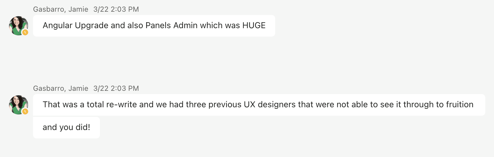 She went on to say that there were 3 previous UX Designers on her team that abruptly left the team when they couldn't handle the demand of the project which further solidified the positive impact of my efforts.