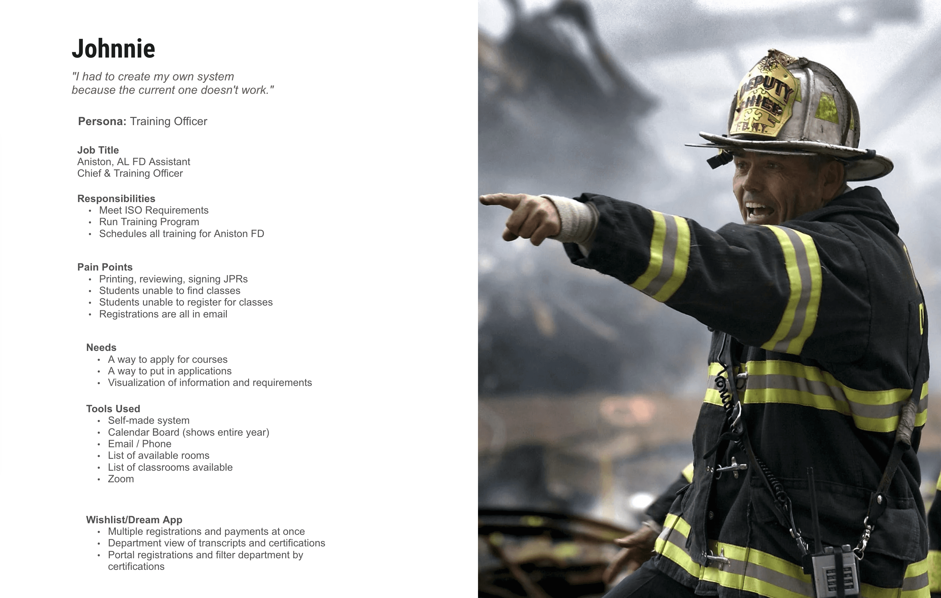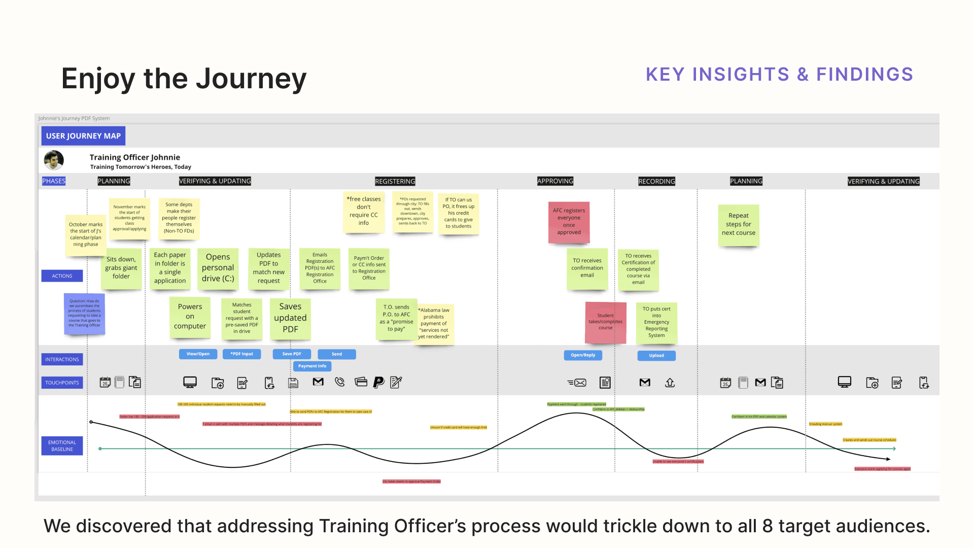 The AFC internal team was extremely helpful in explaining the main target audiences. Through research and user interviews, I discovered that if we could impact Training Officers, the benefits trickled down to every other user group. This became our strategic focus.